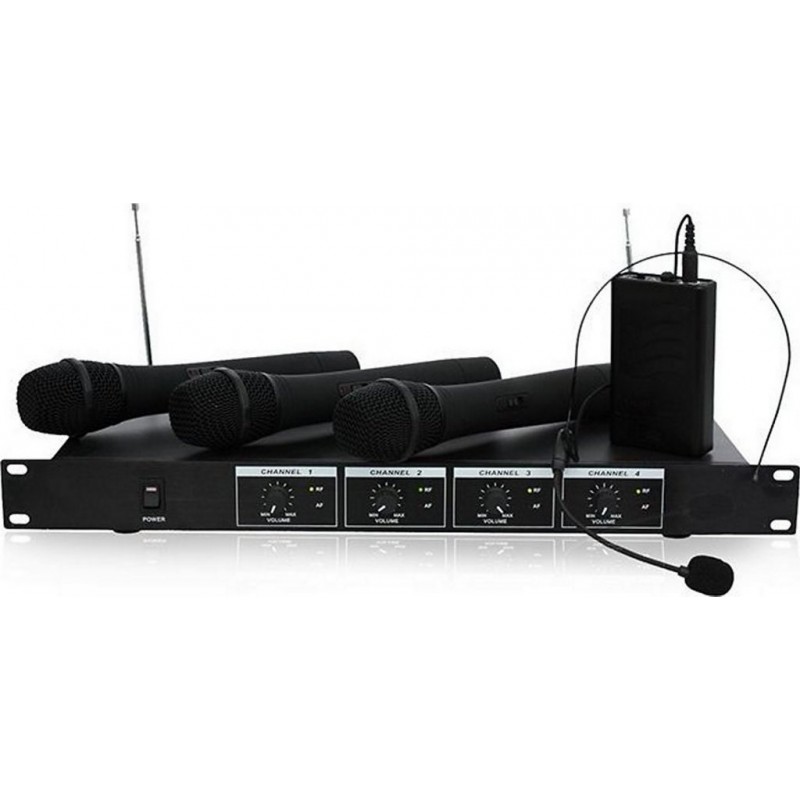 Système sans-fil VHF se composant de 4 microphones émetteurs (3x main et 1x tête) et d&-39 un récepteur. Idéal pour chanteurs, karaoké, présentation, etc. L&-39 émetteur fourni avec le micro tête peut-être utilisé pour une guitare ou autre micro d&-39 un instrument. Caractéristiques techniques: - 3 micros à main VHF - 1 micro de tête VHF avec l&-39 émetteur de ceinture (une guitare peut-être branchée à la place du micro) - Bonne résistance aux fréquences parasites - Fonctionnement super silencieux - Interrupteur M/A silencieux - Fréquences porteuses: 202.1 205.8 203.5 207.5MHz - Modulation: VHF - Plage audio dynamique: > 90dB - Bande passante audio: 50Hz - 15kHZ /-3dB - Niveau de sortie audio: 0-300mV - Rapport S/B: > 70dB - Sensibilité: 3uV pour un rapport S/B de 30dB - THD - Puissance de sortie: 10mW - Alimentation: 220-240Vac - Pile émetteur: 1,5V - Température ambiante:-20 - 50°C - Humidité relative: 10-90%. Produit neuf dans son emballage d'origine bénéficiant de la garantie originale du fabricant. EAN 5420047121950.